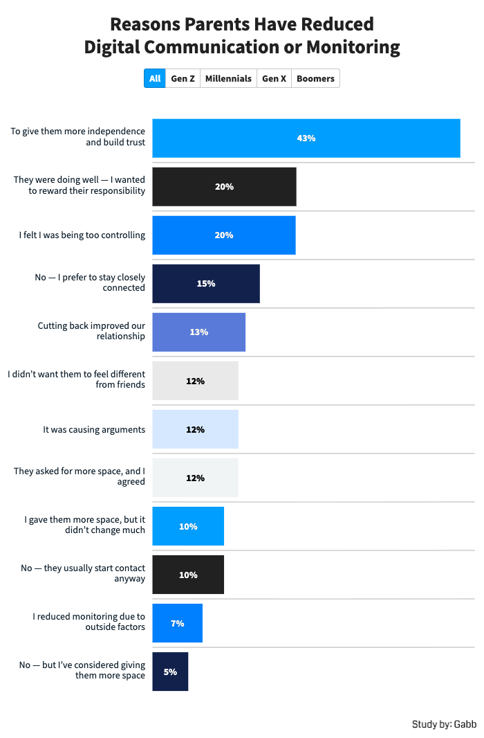 Parenting strategies change as your children get older and more mature, and this applies to digital monitoring as well. The most common reason for parents to pull back from some parental control digital monitoring methods was to intentionally give their children more independence, at 43%. This usually builds trust between parents and children as well.
