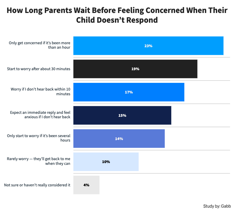 Parents were split on how long they considered to be too long to wait for a reply. The largest share of parents said that they only worry once it’s been an hour (23%), while 19% start to worry after thirty minutes. Another 17% start to worry if they don’t receive a reply within ten minutes, and 15% expect immediate replies no matter what.