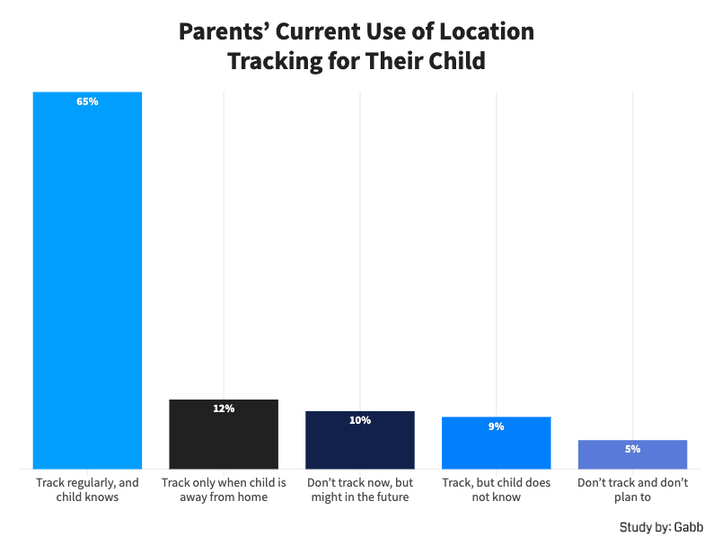 - 85% of parents use GPS or location-sharing to track their child, and 9% do so without their child knowing.